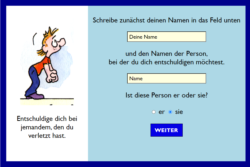 | Entschuldigungsbrief für Kinder und Jugenlichen Diese App hilft Kinder und Jugenlichen einen Entschuldigungsbrief an eine Person zu schreiben, die sie verletzt haben. |